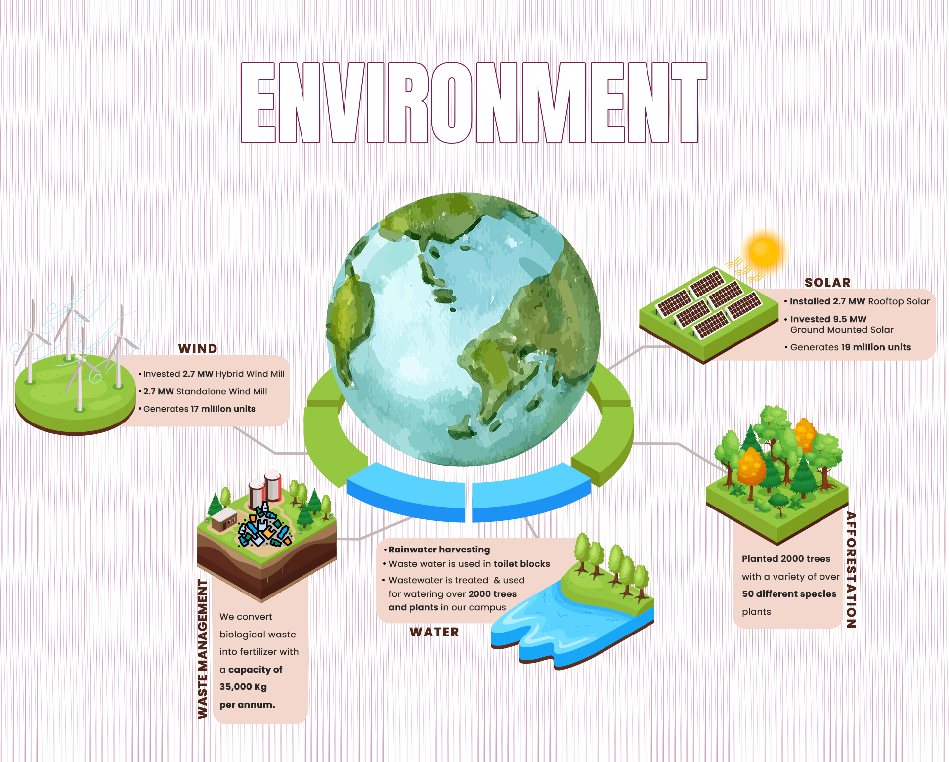 Adopting the motto of GO GREEN at every stage in the business, the group aims at planting more trees inside & outside the campus premises, reducing paperwork by adopting digitalization practices to save trees, and promoting afforestation and social forestry around the campus. The campus is home to more than 2000 trees with a variety of over 50 different species of plants which includes certain ayurvedic plants having medicinal properties.