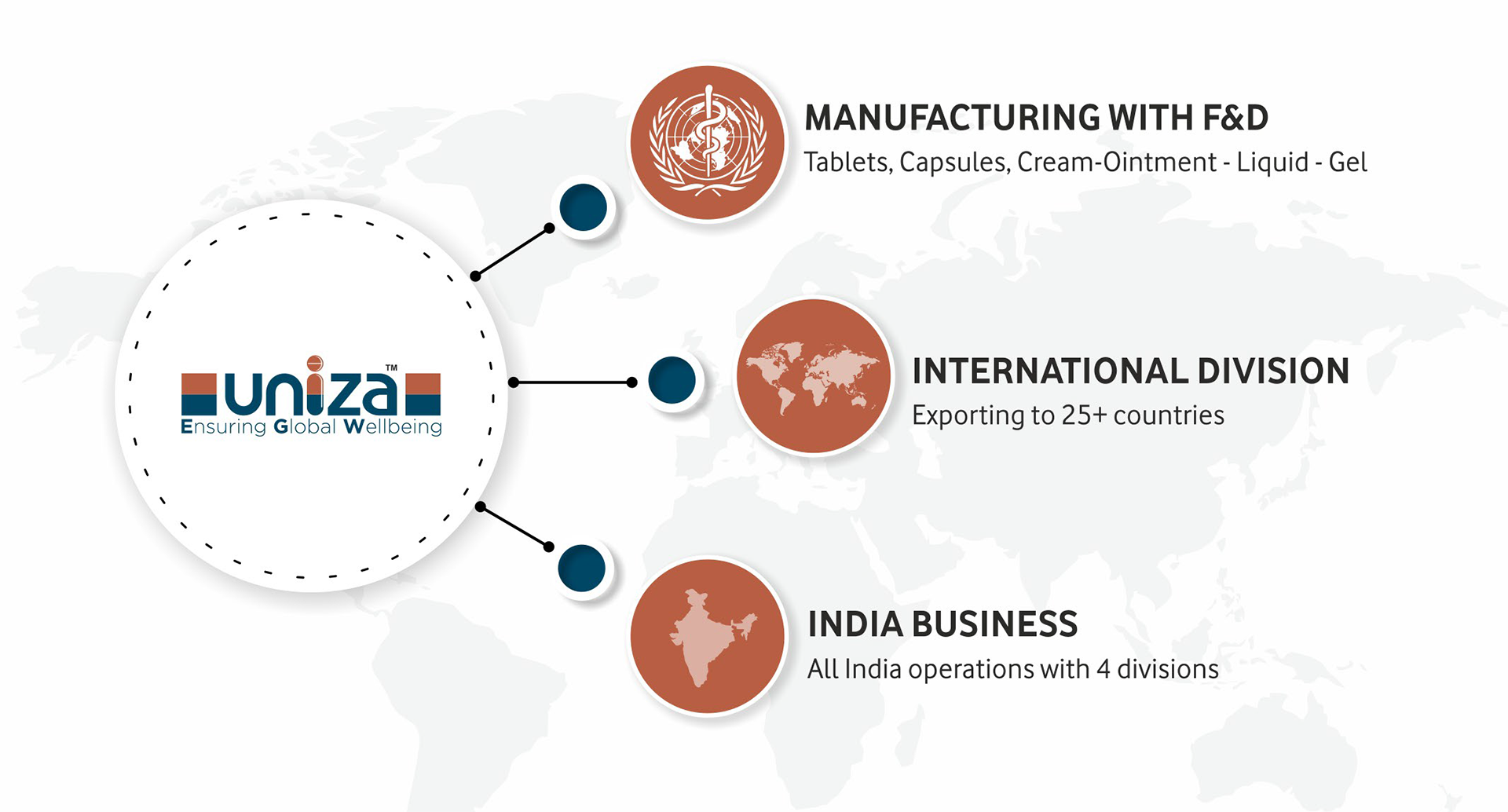 Uniza Group is strategically divided into Uniza Health care LLP and Uniza Life care Private Limited. Uniza Healthcare caters to the Indian market whereas Uniza Lifecare is into international operations and it includes the manufacturing facility and its related businesses.